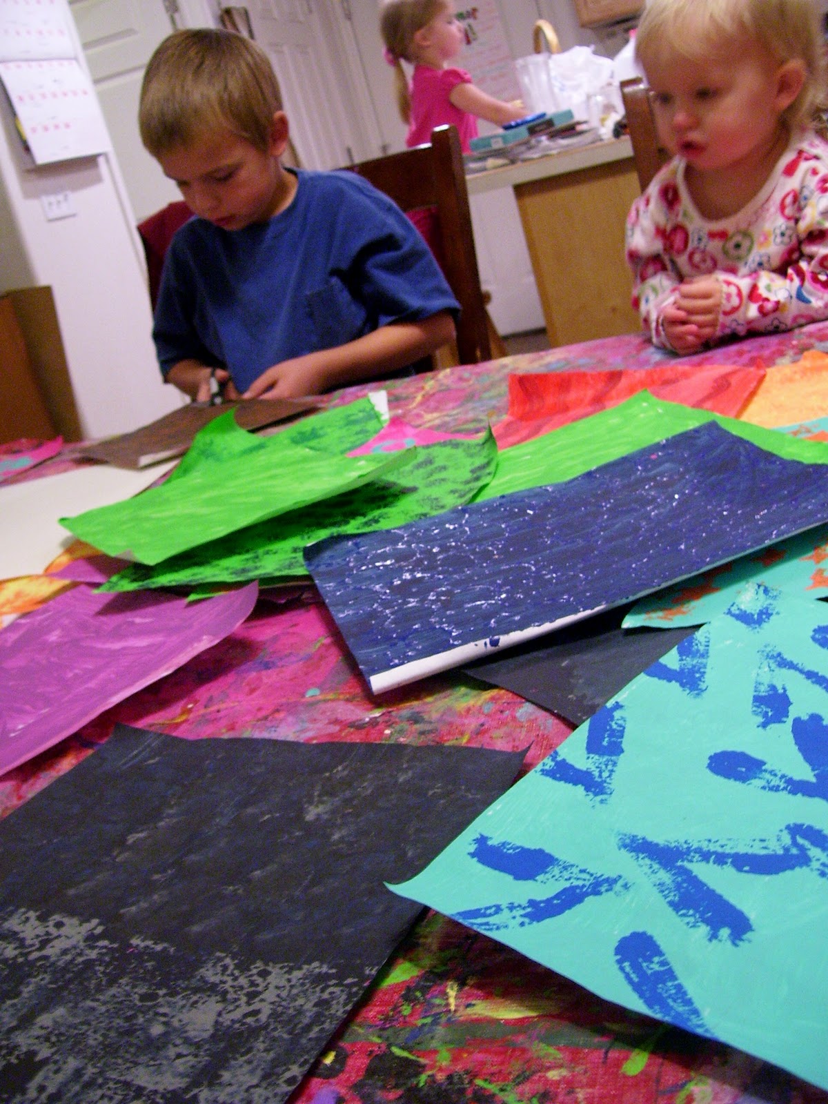 So, anyway....like I said, months ago we started this project. We gathered the paper and the paint and then we rummaged around the house for all sorts of things we could dip in paint and stamp on the paper. We drove trucks through paint and onto paper. We tried old spools. We stamped with the green plastic flower part of fake flowers. We found a star foam shape and tried that. We went wild with paint brushes, letting ourselves splatter the paint in every which way we wanted onto the paper.